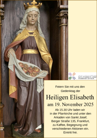 Diese und noch viele andere Informationen und Geschichten werden Sie erfahren können, wenn Sie am 19. November ab 15.30 Uhr in die Bergerstraße 135 (Josefskirche) in Bornheim kommen. An diesem Tag feiert die Kirche den Gedenktag dieser ungewöhnlichen Heiligen und wir nehmen dies zum Anlass, unter den Arkaden von Sankt Josef zum Kaffee und zur Begegnung einzuladen.