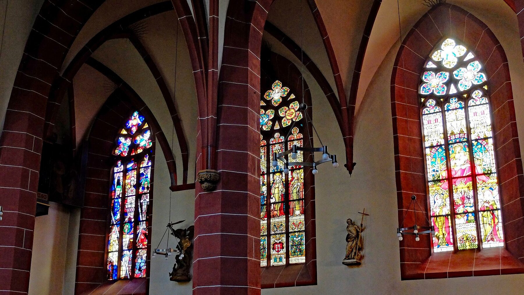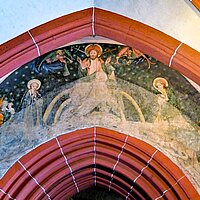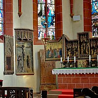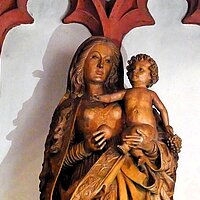 Höhepunkt der Fahrt war der Besuch der Pfarrkirche St. Peter und Paul; einer unsymmetrischen zweischiffigen Hallenkirche erbaut im gotischen Stil. Neben einer Reihe von Skulpturen, Decken- und Wandgemälden machte uns die Stadtführerin besonders auf eine anmutige Mondsichelmadonna aus Lindenholz aufmerksam; ein Werk des „Meisters mit dem Brustlatz“. So genannt weil sich seine weiblichen Heiligenstatuen mit einem zierenden Brustlatz über dem Dekollté auszeichnen. Bemerkenswert ist auch die Schauseite des Kirchturms. In seiner Formensprache verweist der Turm nach Frankfurt. Er wurde nämlich von einem Schüler des Frankfurter Dombaumeisters Madern Gerthener errichtet. In der Tat weist dieser Turm deutliche Ähnlichkeiten mit dem Turm unseres Domturms auf.