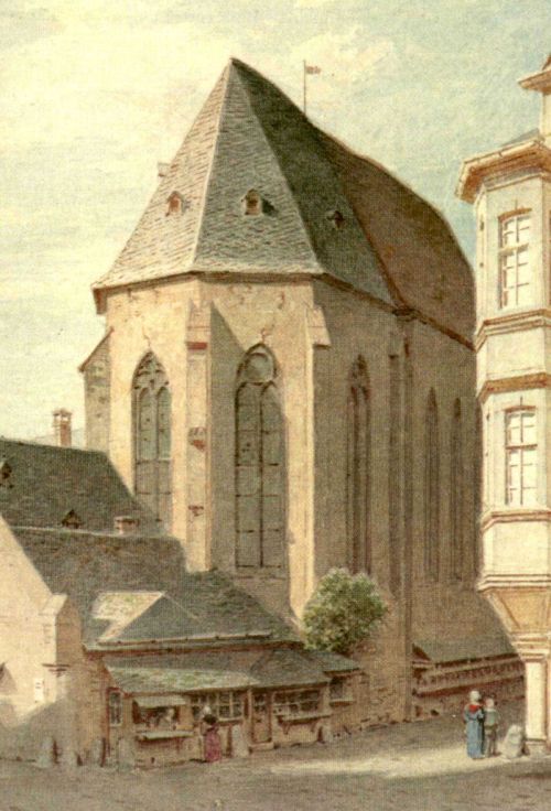 10. 10.1874:   Die Kirchenbaupläne der Bornheimer Missionsgemeinde werden genehmigt durch das Bischöfliche Ordinariat. Vorhergegangen war die Genehmigung durch die königlich-preußische Regierung am 21.09.1874. Architekt Maximilian Meckel hatte die Pläne erstellt auf der Grundlage der Frankfurter Johanniterkirche, die damals an der Ecke Fahrgasse und Schnurgasse (heute Berliner Straße) bereits dem Verkehr weichen musste.