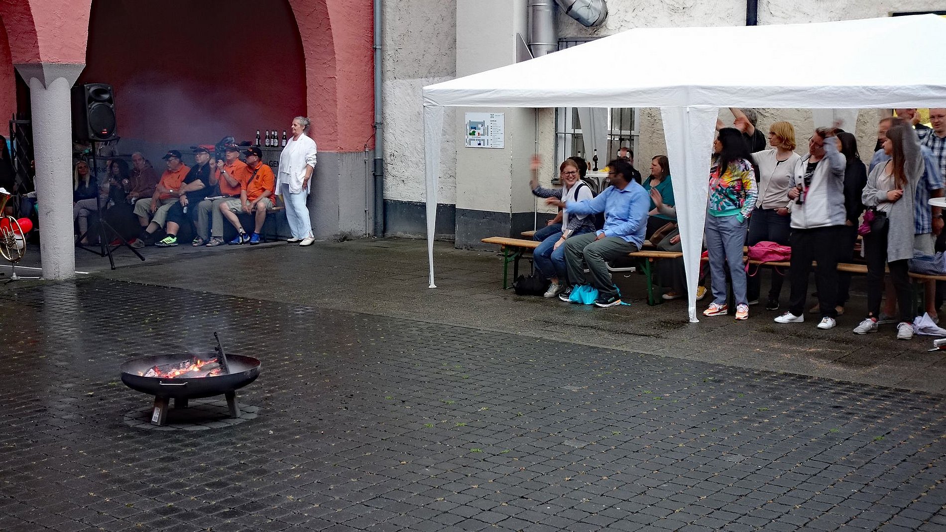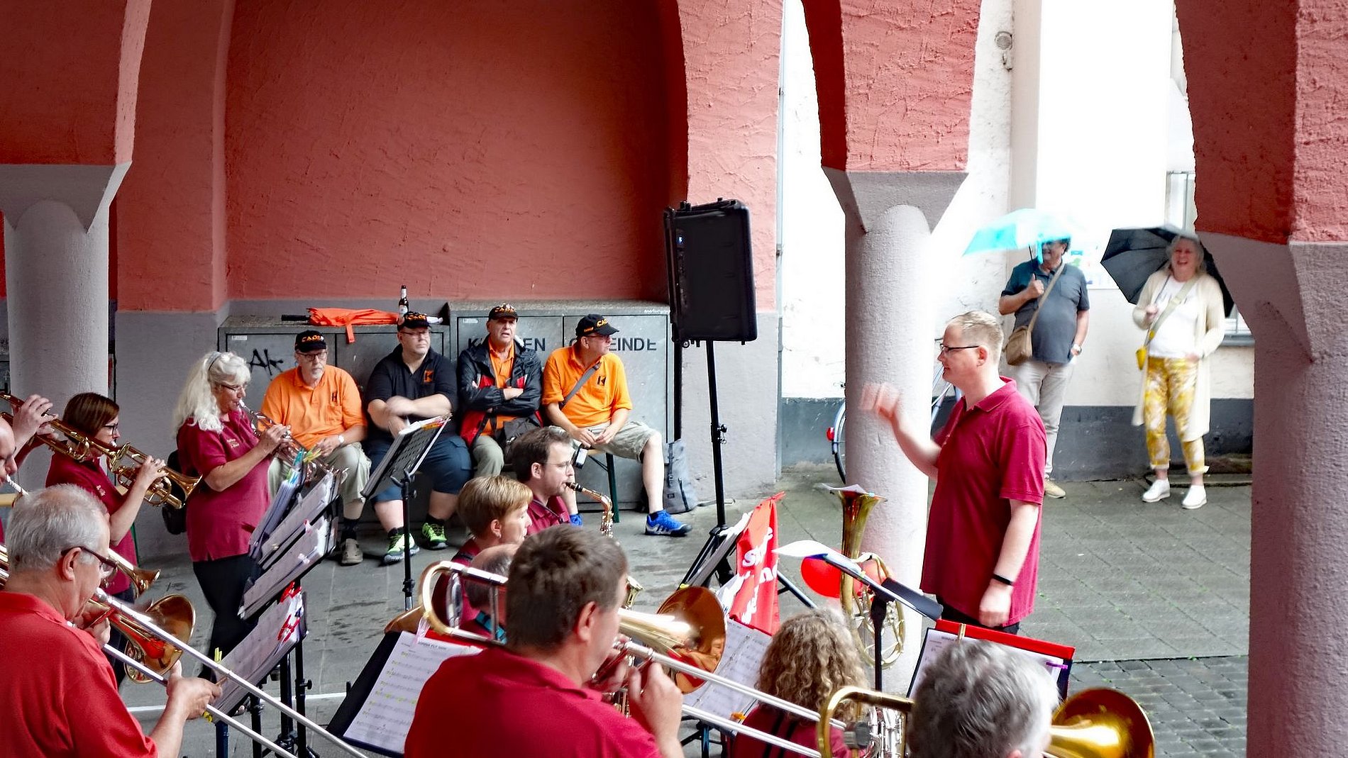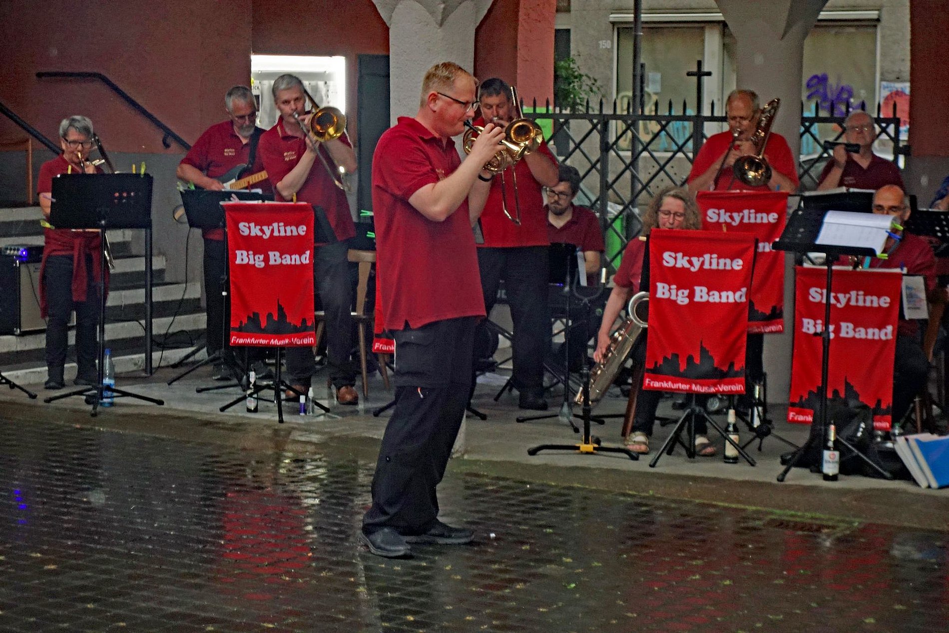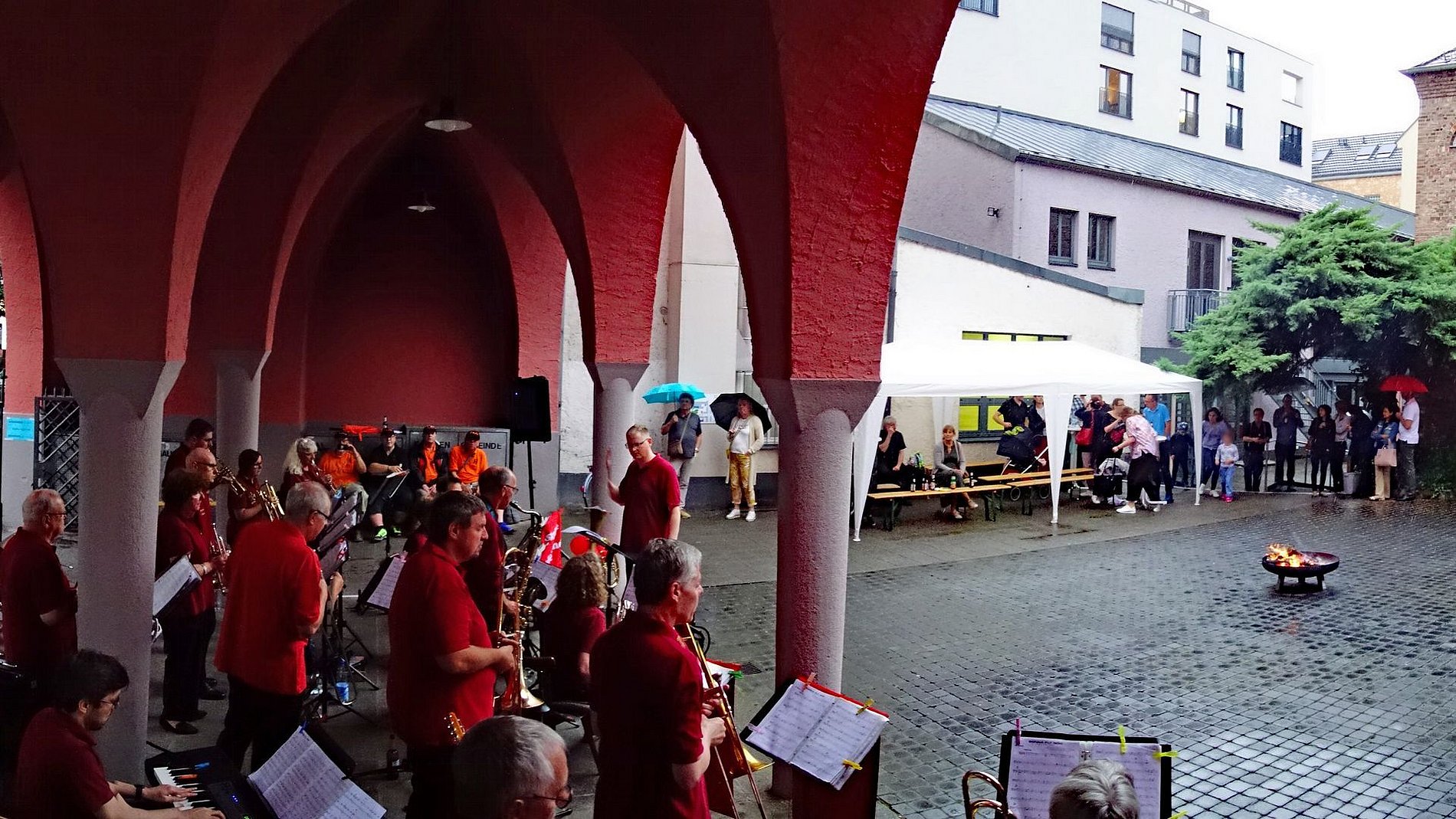 Dennoch trotzte das gesegnete Johannisfeuer auf dem Platz neben den Arkaden dem Dauerregen und die Skyline Bigband heizte der Festgemeinde tüchtig ein. Damit war die Grundlage für die prächtige Stimmung unter den Anwesenden gelegt.