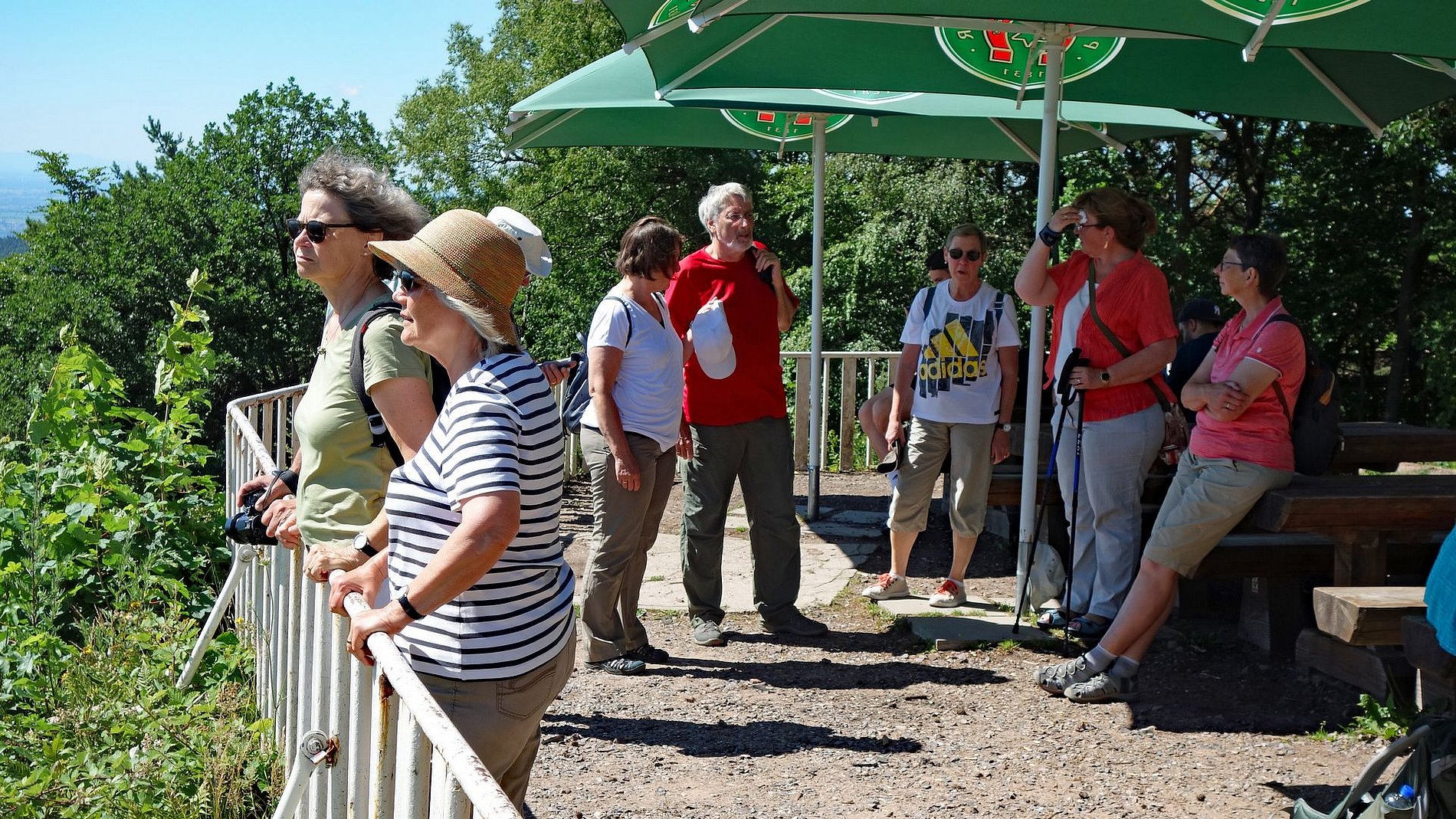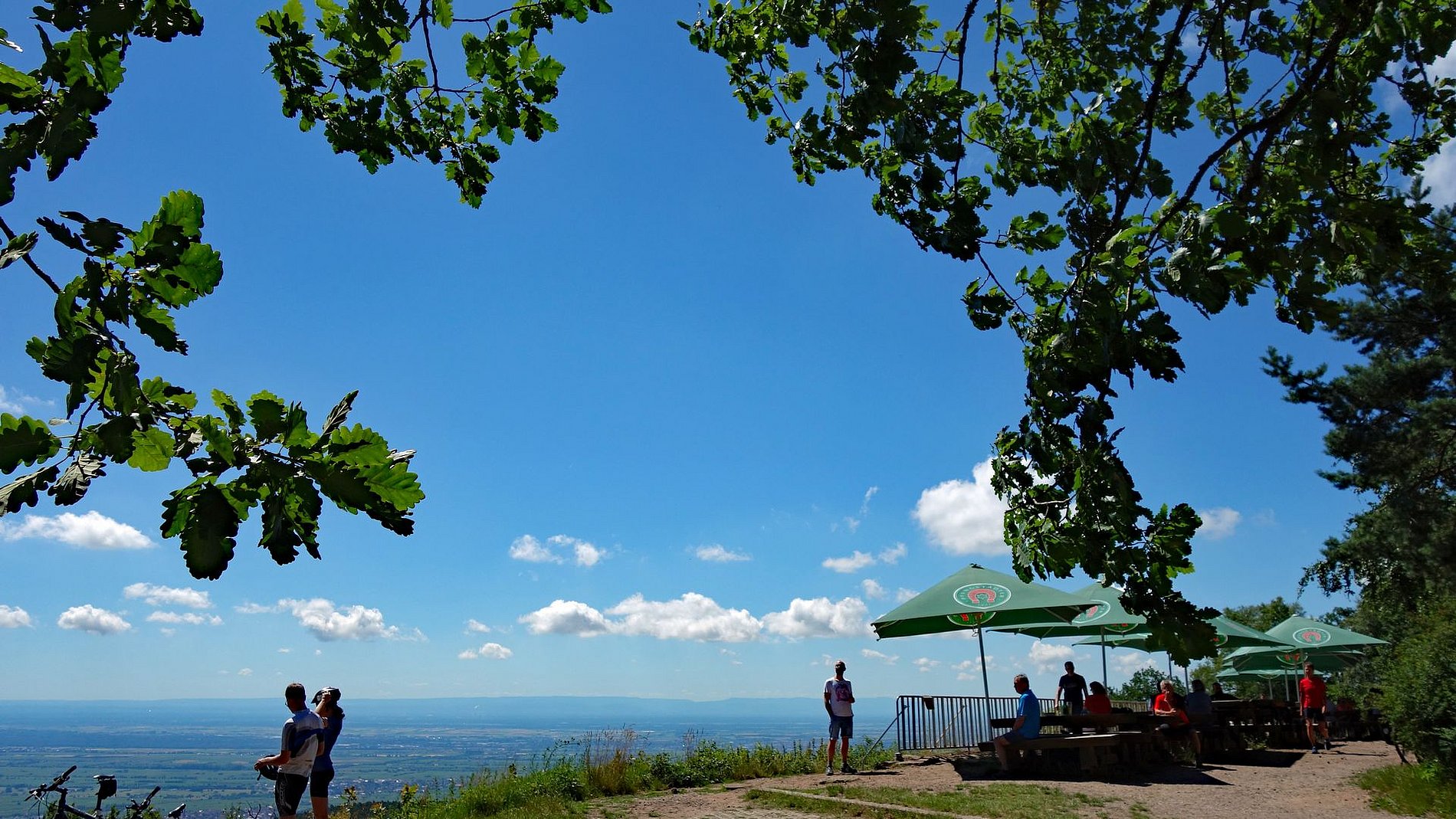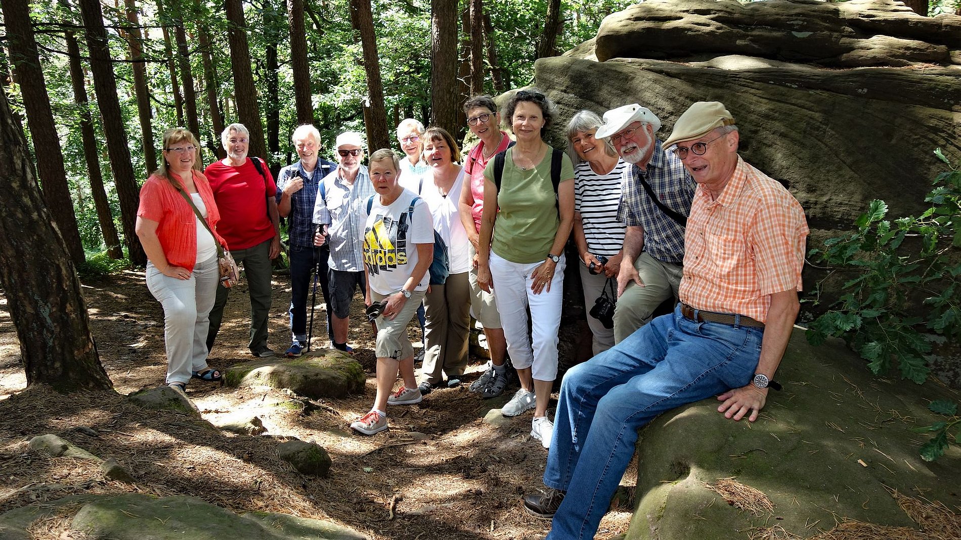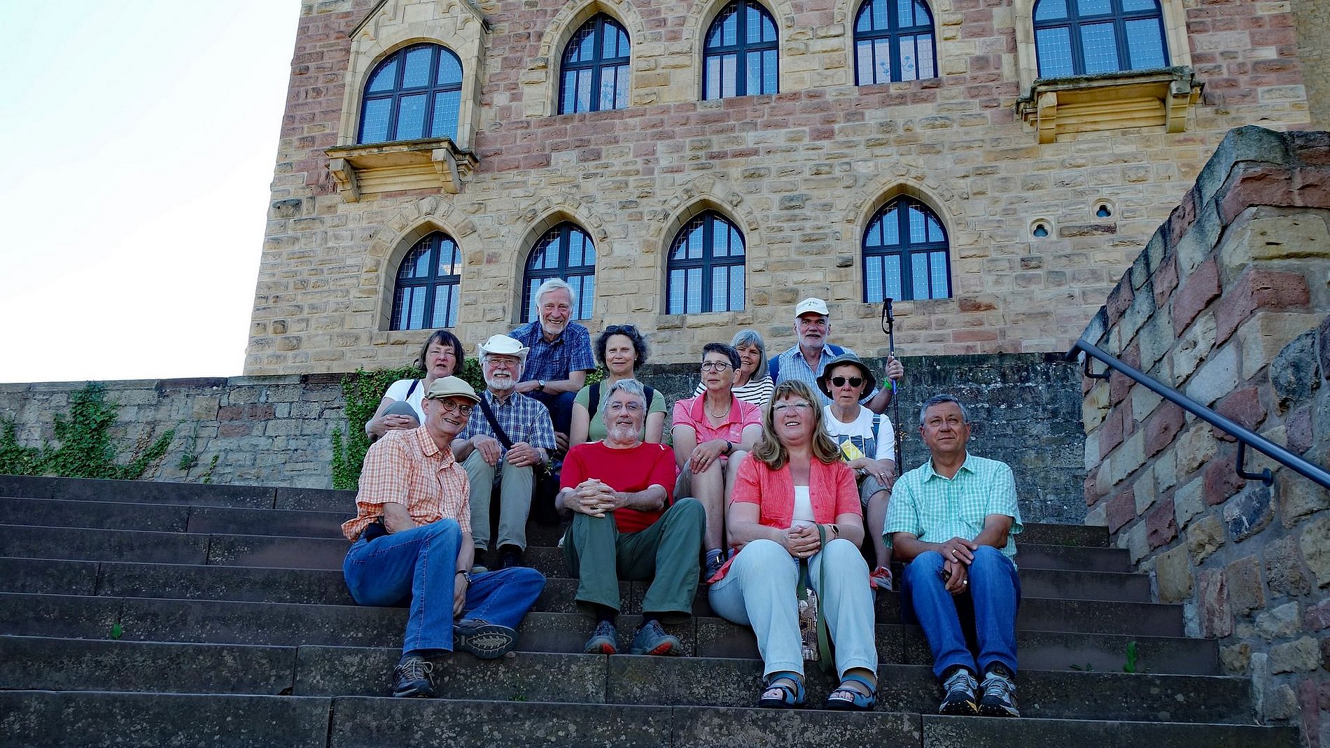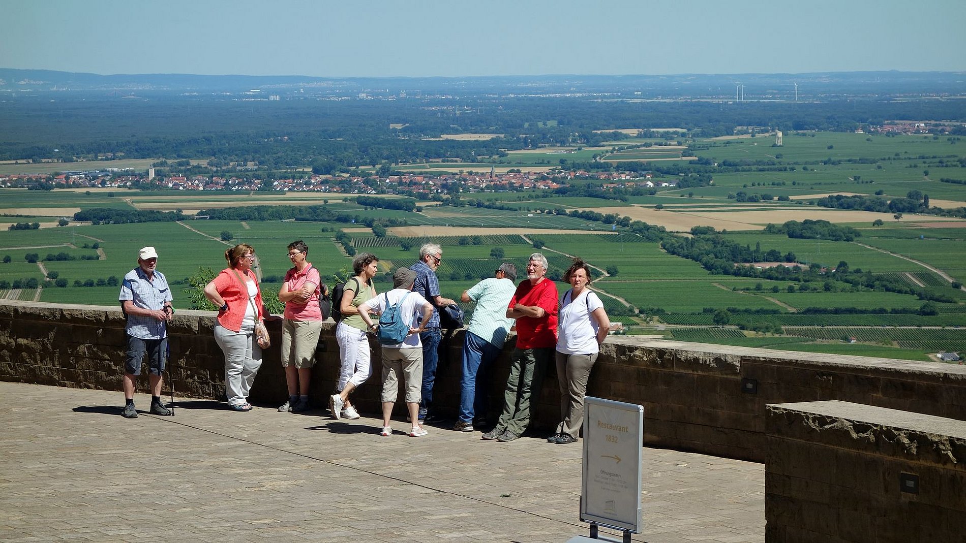 Untergebracht in einem kleinen Landhotel in Siebeldingen machte sich der Kreis auf eine Erkundungstour in die vielfältige und vom Wein geprägte Umgebung. Dabei fiel gleich auf, dass an der Pfälzer Weinstraße ein Dorf schöner als das andere ist; und die Gruppe kam durch eine Reihe von Dörfern um ihre eigentlichen Ziele zu erreichen. Das erste Ziel war die Kalmit, die höchste Erhebung des Pfälzer Waldes. Von dort hat man eine herrliche Aussicht auf die Rheinebene, den südlichen Odenwald und den nördlichen Schwarzwald. Auf einem der Vorberge der Kalmit liegt das Felsenmeer, das der Familienkreis durchquerte. Ein kleines Abenteuer. Das nächste Ziel war das Hambacher Schloss, eine Wiege der deutschen Demokratie. Auch von dort konnte die Gruppe herrliche Ausblicke genießen. Am Sonntag ging es nach der gemeinsamen Eucharistiefeier in der Landauer Marienkirche weiter nach Bad Dürkheim, wo eine kundige Stadtführerin unserem Familienkreis den Kurort näher brachte. Nach der Mittagspause am großen Fass ging es wieder gen Heimat.