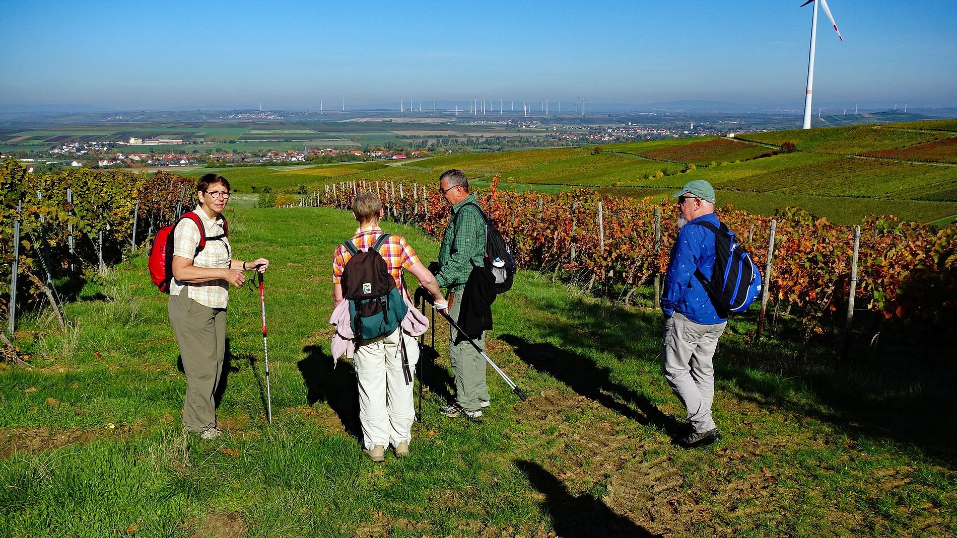 Am Wegesrand waren immer wieder Hinweise auf den Erzabbau zu entdecken. Nach einem ersten Anstieg erreichte die Wandergruppe ein Plateau. Von hier gab es herrliche Blicke bis zum Donnersberg, Pfälzer Wald und auf der anderen Rheinseite bis zum Odenwald. Neben dem Rebenmeer Rheinhessens prägen die vielen Windräder inzwischen die Landschaft, was dem Naturgenuss aber keinen Abbruch tat.