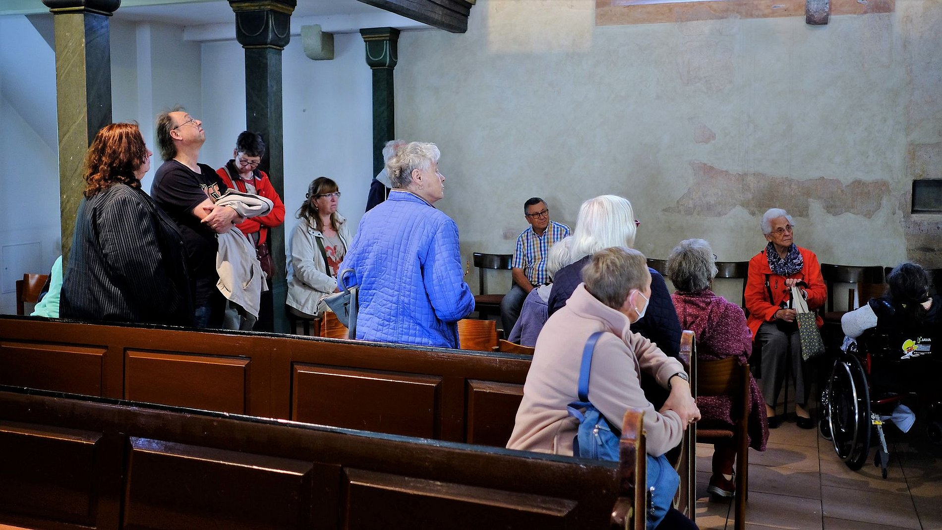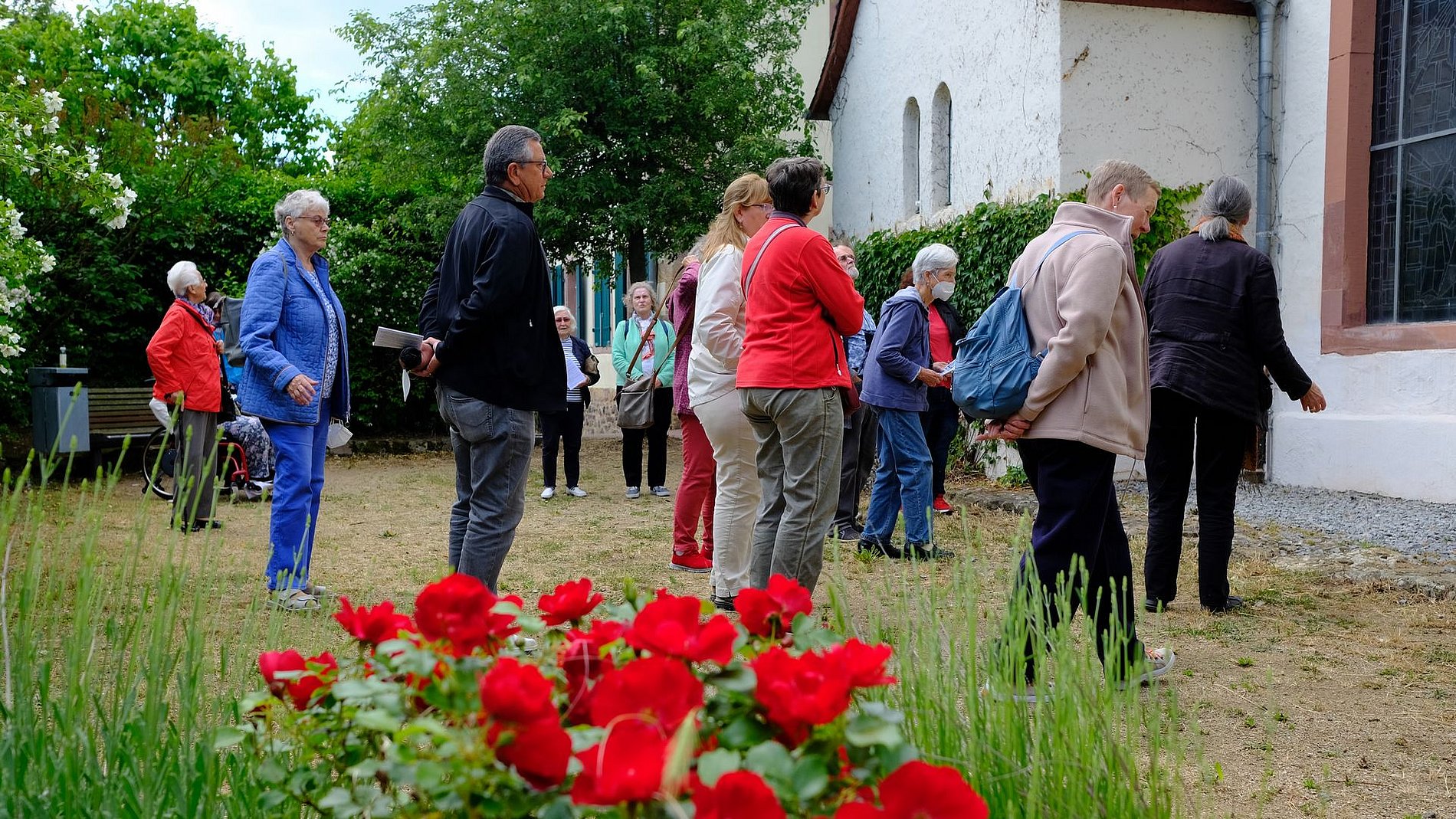 Mit der Preungesheimer Kreuzkirche erwartete die Gruppe von „Kirche und Kunst“ ein Gotteshaus, das im Laufe seiner Geschichte mehrmals seine Gestalt wechselte. Es ist von mehreren Vorgängerbauten auszugehen. Heute zeigt sich die Kreuzkirche im barocken Gewand. Ihre Ursprünge weisen jedoch ins frühe Mittelalter zurück. Bei der Kreuzkirche handelt sich um eines der ältesten Sakralgebäude der gesamten Region. Die erste Bauphase geht auf die Merowingerzeit zurück. Dass die Kreuzkirche etwas Besonderes ist, zeigt sich auch darin, dass sie in die Liste der Kulturgüter nach der Haager Konvention aufgenommen wurde.